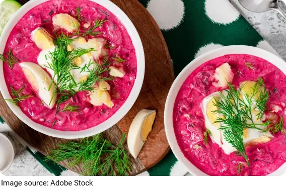 This refreshing soup is perfect as a first course or a light summer meal. Its combination of beets, cucumbers, fresh dill, and spring onions with sour milk or kefir gives it a tangy, creamy flavor. Traditionally, it is served with boiled potatoes and garnished with hard-boiled eggs and extra dill.