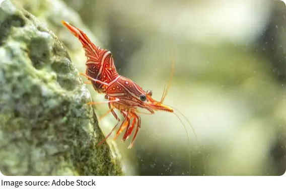 Its movement is one of its most memorable traits. Rather than gliding smoothly for long stretches, the shrimp often makes quick, dance-like motions that give it a lively presence. This behavior, paired with its bright pattern, makes it a favorite among marine life observers. The shrimp is an omnivore and typically feeds on small organic matter, detritus, and other tiny food sources it finds around the reef. In this way, it helps recycle material within its environment.